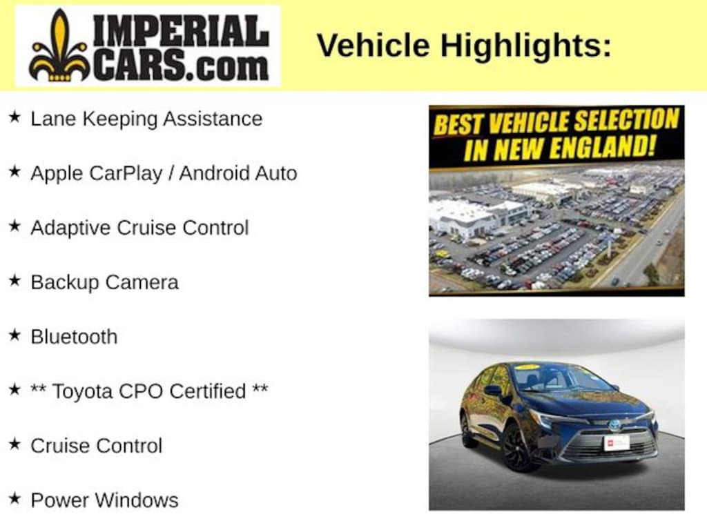Lane Keeping Assistance, Apple CarPlay / Android Auto, Adaptive Cruise Control, Backup Camera, Bluetooth, ** Toyota CPO Certified **, Cruise Control, Power Windows, Power Locks, Steering Wheel Radio Controls, 1.8L DOHC 16V VVT. Certified. Blueprint 2023 Toyota Corolla Hybrid LE LE 4D Sedan 1.8L DOHC 16V VVT FWD CVT