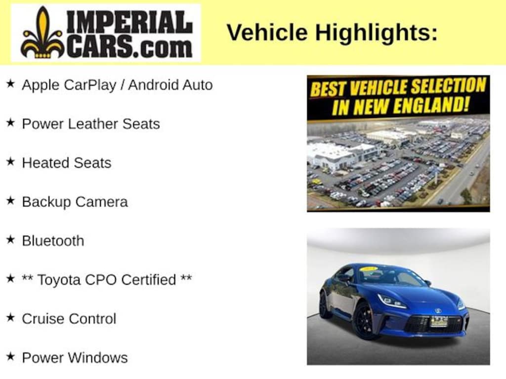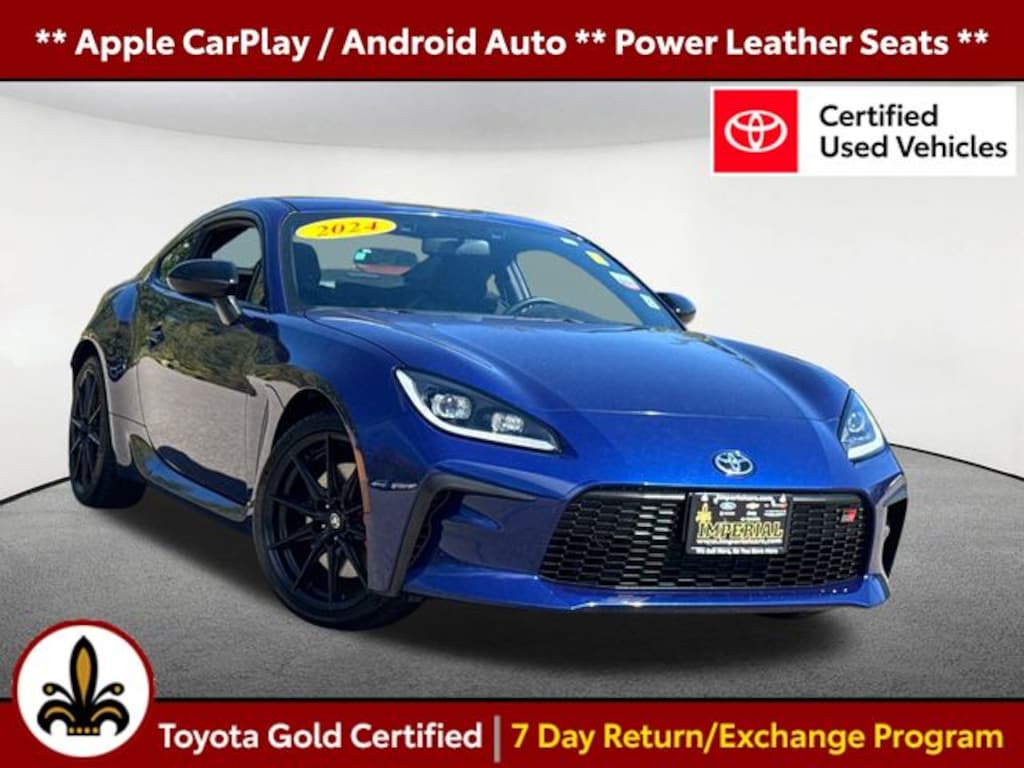 Apple CarPlay / Android Auto, Power Leather Seats, Heated Seats, Backup Camera, Bluetooth, ** Toyota CPO Certified **, Cruise Control, Power Windows, Power Locks, Steering Wheel Radio Controls, Aluminum Wheels. Certified. Trueno Blue 2024 Toyota GR86 Premium Premium 2D Coupe 2.4L 4-Cylinder DOHC 16V RWD 6-Speed Manual