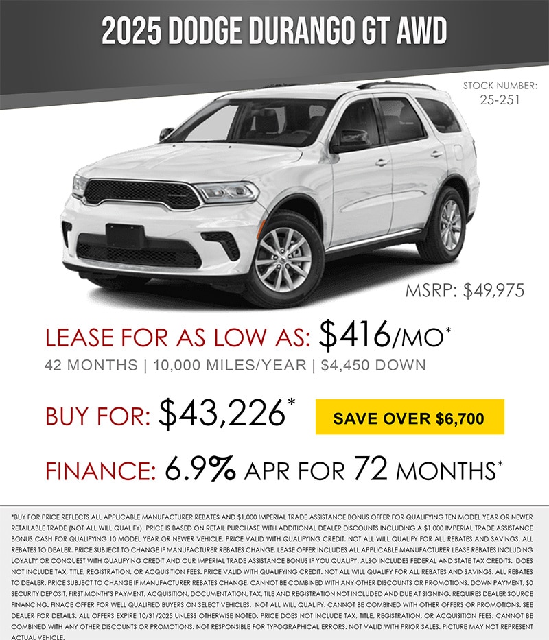 Buy For Price reflects all applicable manufacturer rebates and/or incentives including conquest/loyalty and is based on retail purchase with additional dealer discounts including a $1,000 Imperial Trade Assistance Bonus for qualifying 10 model year or newer retailable trade (not all will qualify). Price subject to change if manufacturer rebates change. Lease, business and fleet acquisitions may result in a different pricing and rebate structure. Price does not include tax, title, registration, and documentation fee or other applicable fees. Vehicle must be paid in full and take same day delivery from dealer stock. No wholesalers or dealers. Price cannot be combined with any other discounts or promotions. Not responsible for typographical or pricing errors. Transparency is our goal. Call 1-800-526-2886 to find out what incentives you will qualify for and to receive your personalized buy for price.