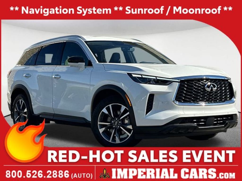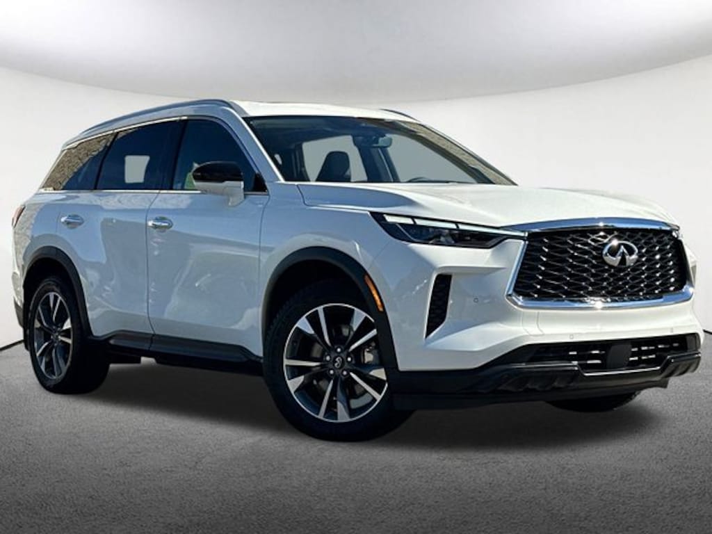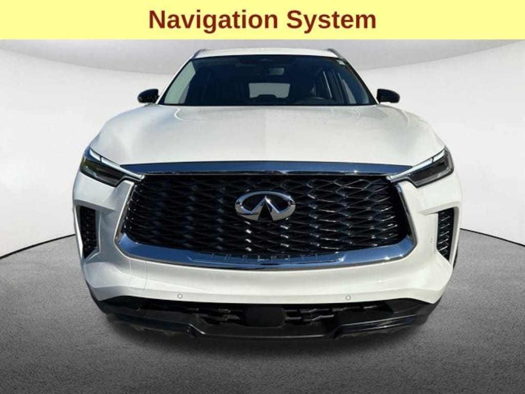 Navigation System, Sunroof / Moonroof, Blind Spot Monitor, Apple CarPlay / Android Auto, Lane Keeping Assistance, Adaptive Cruise Control, Cross Traffic Alert, Power Leather Seats, Heated Seats, Backup Camera, Bluetooth, Remote Engine Starter, Cruise Control, Power Windows, Power Locks, Steering Wheels Radio Controls, Aluminum Wheels, Third Row Seats, Navigation system: INFINITI InTouch Navigation. Majestic White/Black Obsidian 2025 INFINITI QX60 LUXE 4D Sport Utility LUXE AWD 9-Speed Automatic